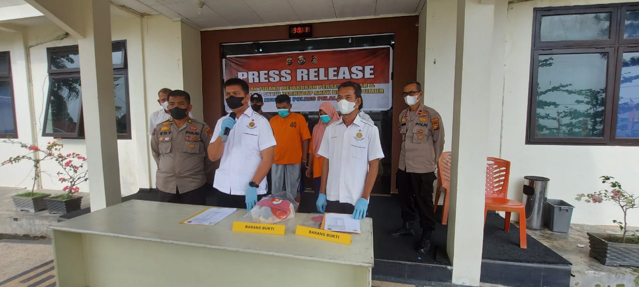 AKP NM Marbun SH didampingi Kasubag Humas AKP Edy Haryanto SH dan staf Reskrim menghadirkan dua tersangka yang merupakan pasangan suami istri (Pasutri). Tersangka PM (43) dan NT (42) yang bekerja dan tinggal di salah satu perumahan perusahaan di Bandar Petalangan Kabupaten Pelalawan. Sedangkan korban MSD (16) masih dalam perawatan merupakan satu marga dengan tersangka PM yang sehari hari telah tinggal satu rumah sejak 7 bulan lalu dengan tersangka.
