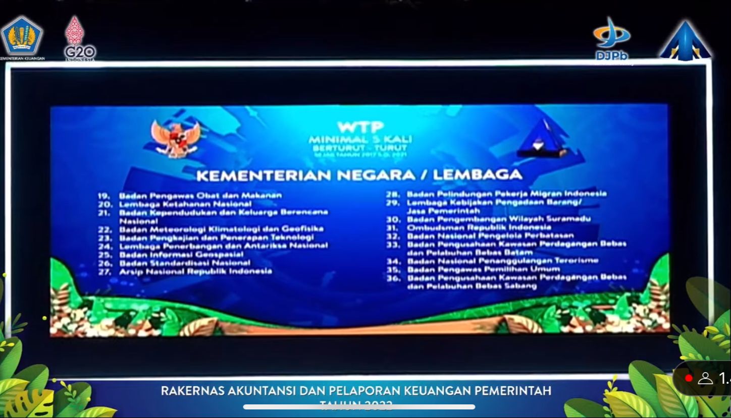 Rakernas Akuntansi dan Peloporan Keuangan Tahun 2022 dihadiri 82 Kementerian Negara / Lembaga Pemerintah serta pemerintah daerah. Acara dibalut dengan pemberian penghargaan kepada entitas peloporan peraih Opini Wajar Tanpa Pengecualian (WTP) dengan sejumlah kategori, seperti : Opini WTP untuk laporan keuangan tahun 2021, Opini WTP minimal 5 kali berturut-turut yang diberikan melalui video announcement dan penganugerahan secara langsung diberikan kepada entitas peraih Opini WTP minimal 10 kali berturut-turut; Opini WTP minimal 15 kali berturut-turut.