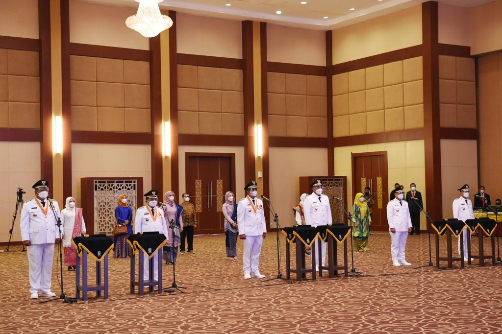 Dompak, MediaKepriNews.Com- Gubernur Kepulauan Riau H. Ansar Ahmad melantik Bupati dan Wakil Bupati Kepulauan Anambas, Bupati dan Wakil Bupati Bintan serta Bupati dan Wakil Bupati Lingga masa jabatan 2021-2024 di aula Wan Seri Beni, Pulau Dompak, Tanjungpinang, Jumat (26/2)