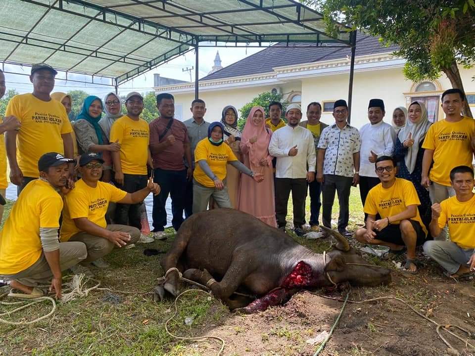 Sekretaris DPD II Golkar Pelalawan yang juga Ketua DPRD Pelalawan mengatakan DPD II Partai Golkar Pelalawan sembelih kerbau korban untuk dibagi bagi kepada masyarakat yang membutuhkan sekitar kantor DPD II Golkar.