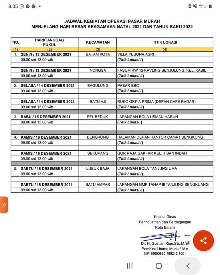 Sementara jadwal operasi pasar dilaksanakan pada sembilan kecamatan mainland selama lima hari, yaitu tanggal 13 Desember hingga 18 desember 2021 dari pukul 09.00 WIB sampai pukul 13.00 WIB.