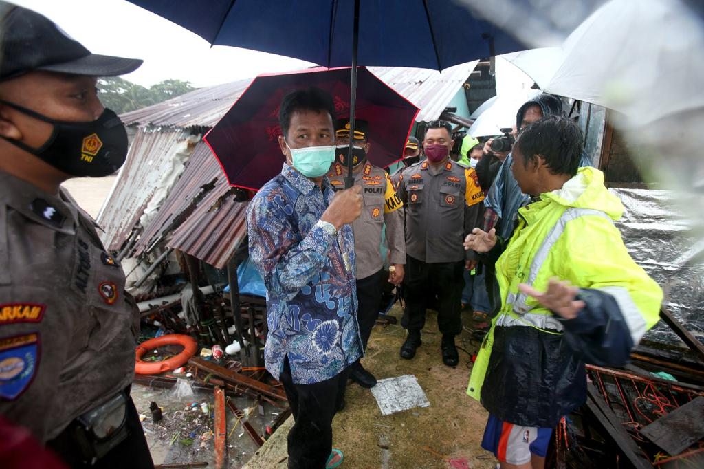 Walaupun hujan cukup deras, Kepala BP Batam, Muhammad Rudi, mengenakan sandal jepit dan baju batik warna biru datang dan meninjau lokasi kejadian.
