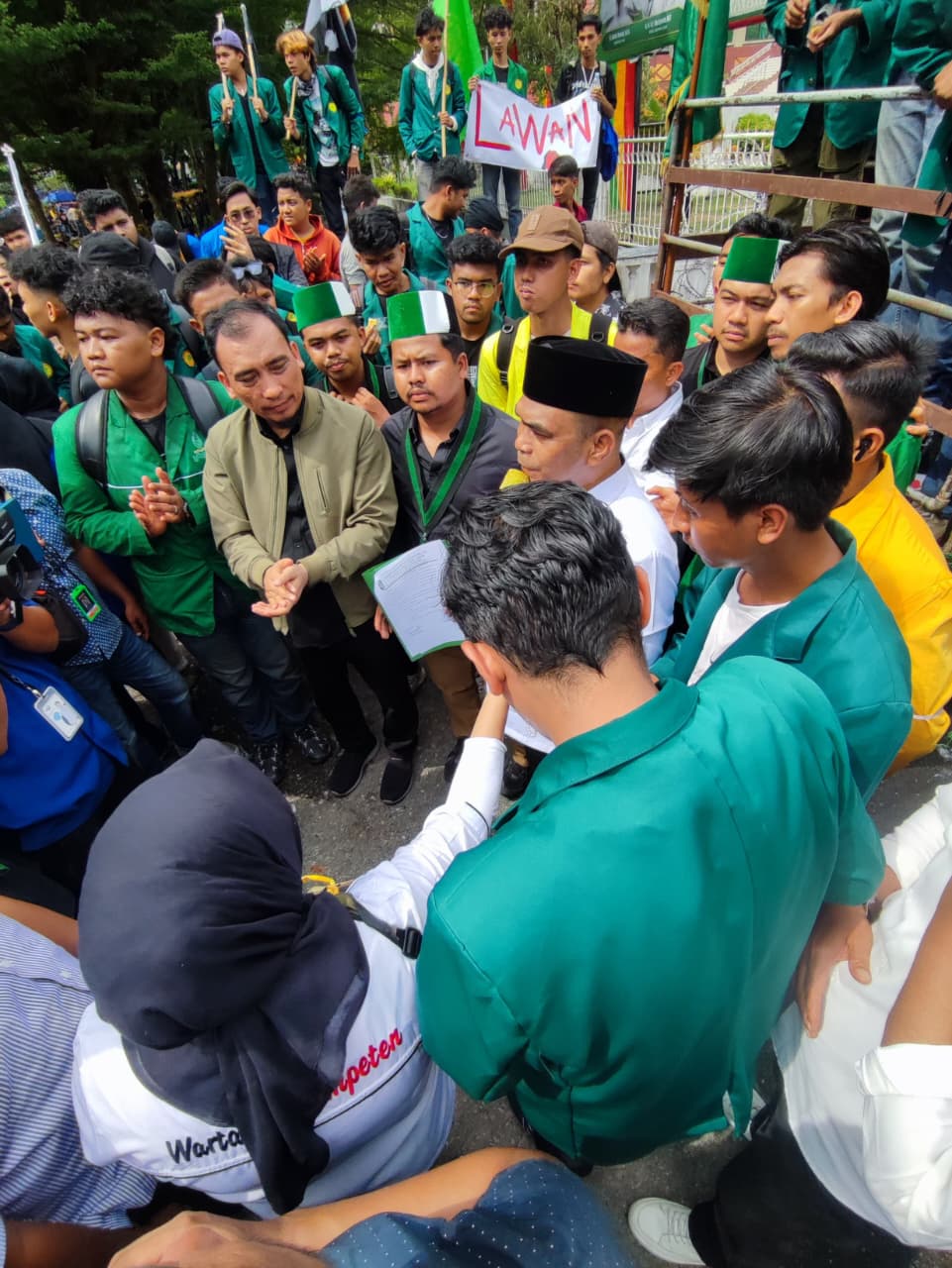 Aksi berlangsung tertib dan kondusif. Massa diterima langsung oleh Ketua DPRD Provinsi Riau untuk menyerahkan naskah tuntutan.