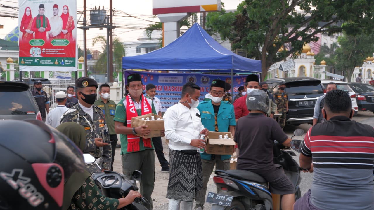 Pelalawan, MediaKepriNews.Com-Bupati Pelalawan H Zukri Misran memimpin pembagian ribuan perlengkapan protokol kesehatan (prokes) terdiri dari masker, hand sanitizer dan vitamin C di Jalan Lintas Timur Pangkalan Kerinci, Jumat, (28/05/2021). Pembagian perlengkapan prokes sebagai upaya meningkatkan kepedulian seluruh lapisan masyarakat menekan dan memutus mata rantai penyebaran corona virus disease 2019 (COVID-19).