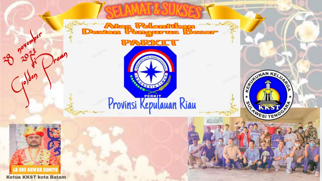 Kemudian ucapan selamat dan sukses juga di sampaikan dari Tokoh Keluarga Besar Sulawesi Tenggara Kota Batam.La ode Anwar Sumito, mengucapkan selamat dan sukses kepada Anggelinus SH selaku Ketua Umum Perkit Kepri, Dr. I wayan Catra Yasa, MM selaku Sekretaris umum dan Gunawan ST sebagai Bendahara Umum Perkit Kepri dan seluruh jajaran pertikal pengurus Perkit Kepri.