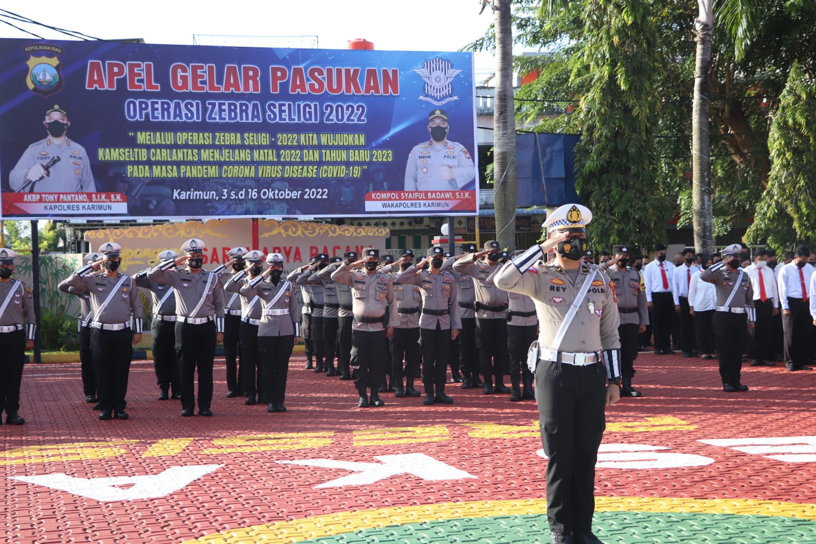 Adapun apel gelar pasukan operasi Zebra Seligi 2022 tersebut dipimpin langsung oleh Kapolres Karimun AKBP Tony Pantano, S.I.K., S.H. dan dihadiri pejabat utama Polres Karimun, Pom AD, Pom AL, Dishub dan personil Polres Karimun. Sebelum memberikan amanat, Kapolres Karimun AKBP Tony Pantano, S.I.K., S.H menyematkan pita tanda operasi kepada perwakilan dari, Pom AD, anggota personil Satlantas, dan Dishub.