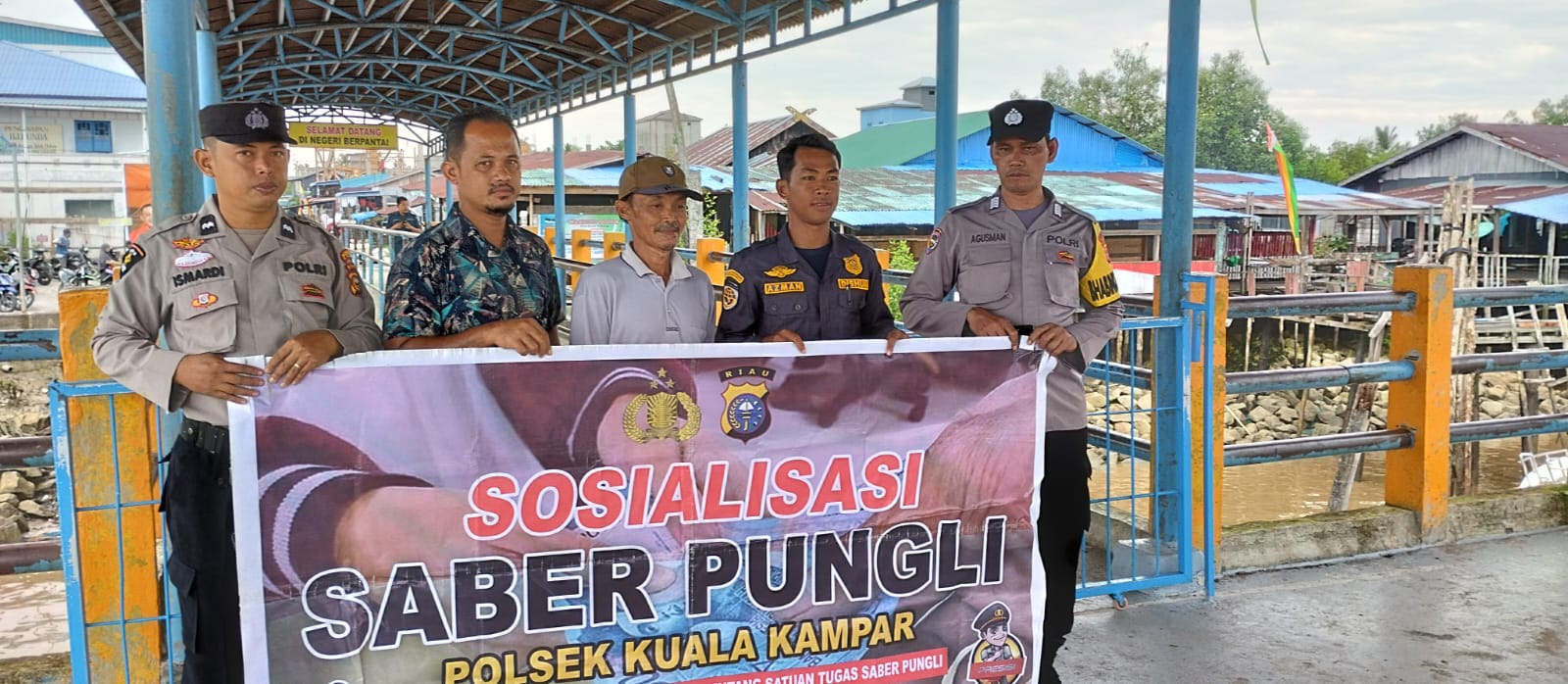 Kapolsek menyampaikan sosialisai satgas saber pungli pada petugas pelabuhan ,  serta warga yang di areal Pelabuhan Kecamatan Kuala Kampar melakukan kegiatan  pelayanan di areal Pelabuhan Kecamatan Kuala Kampar.