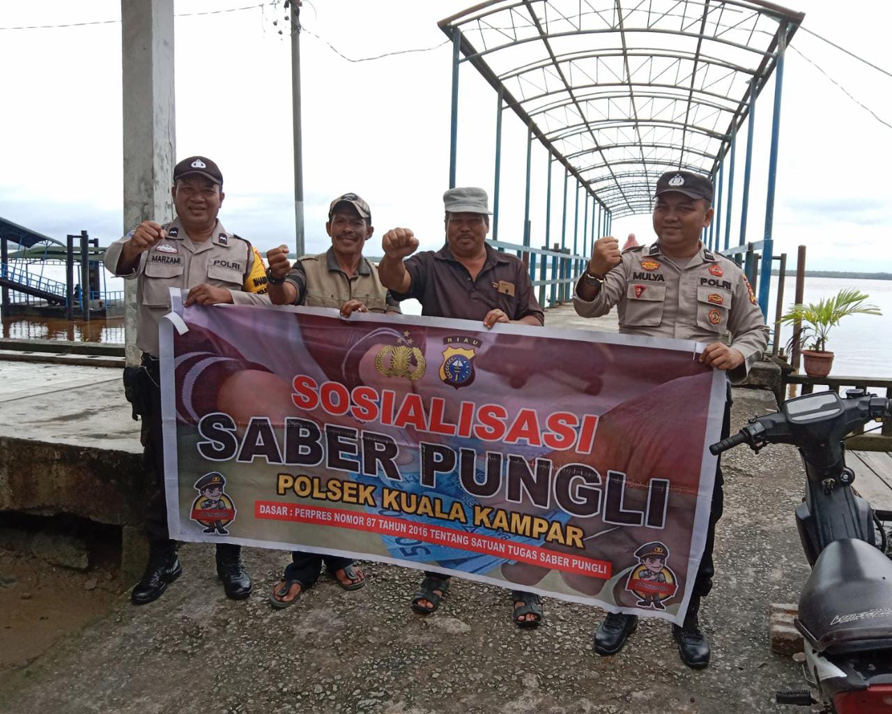 Kapolsek menyampaikan sosialisai satgas saber pungli pada petugas pelabuhan , serta warga yang di areal Pelabuhan Kecamatan Kuala Kampar melakukan kegiatan pelayanan di areal Pelabuhan Kecamatan Kuala Kampar.