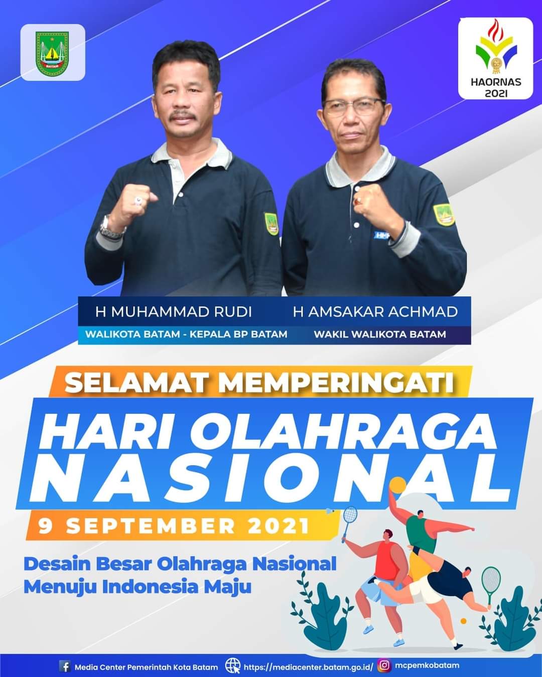 Batam, MediaKepriNews.Com- Peringatan Hari Olahraga Nasional (Haornas) ke-38 jatuh pada Kamis (9/9/2021). Wali Kota Batam Muhammad Rudi dan Wakil Wali Kota Batam Amsakar Achmad turut mengucapkan selamat memperingati Haornas 2021.
