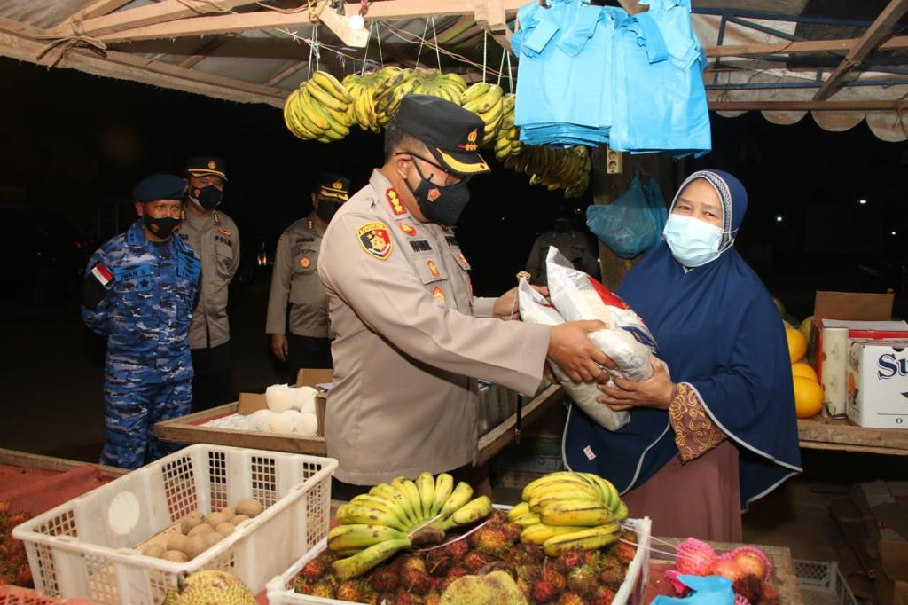 Kapolresta menyerahkan paket bantuan pangan kepada para pedagang di wilayah Jln. Hang Jebat Kel. Batu Besar Nongsa, dengan menyiapkan sekitar 300 paket bantuan pangan, terdiri dari 5kg beras, minyak goreng 2 liter, gula, Sarden dan Masker.
